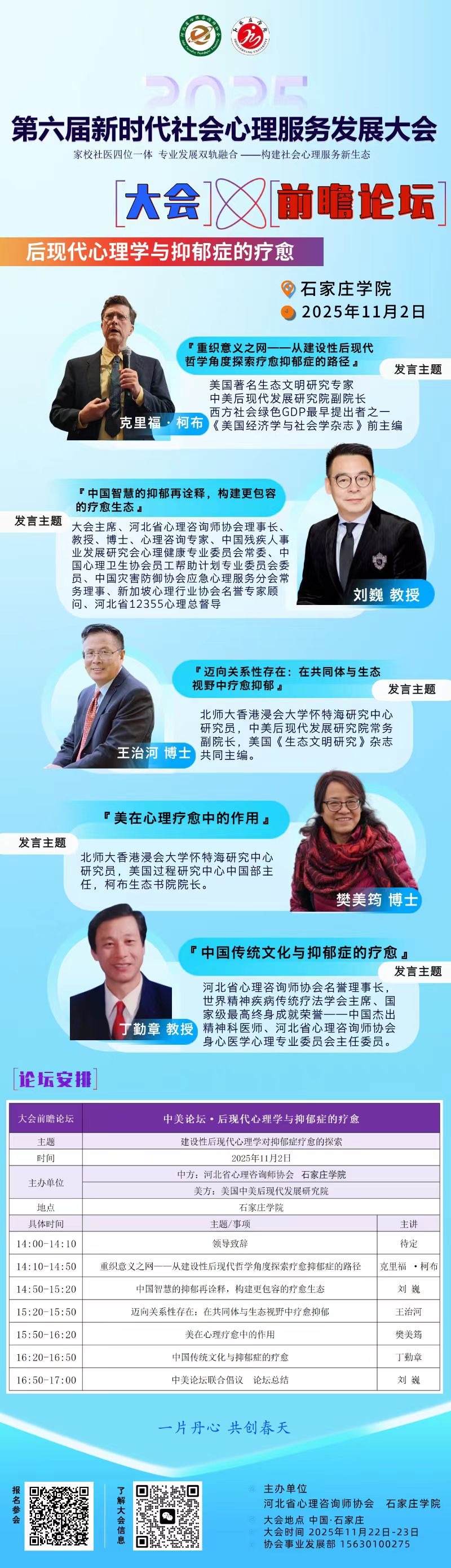 本次论坛旨在通过国内外专家的深入交流与思想碰撞,深化后现代心理学在抑郁症疗愈领域的理论探索,促进中国传统文化与西方心理学思想的对话融合,为创新社会心理服务模式提供学术支撑与实践参考。